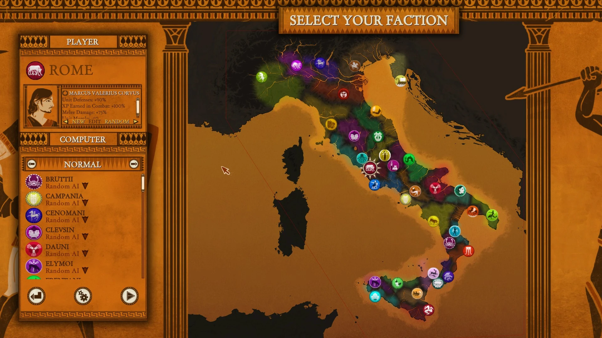 Players start with one city from over 25 different Factions and are tasked with gathering Resources, building an army and capturing territory. Campaigning takes place on a single continuous map of ancient Italy where players can zoom between the 3D tactical map and the 2D strategy map at any time. Gameplay can be paused at any time and players may issue orders and inspect their empire while the game is paused.